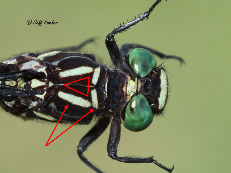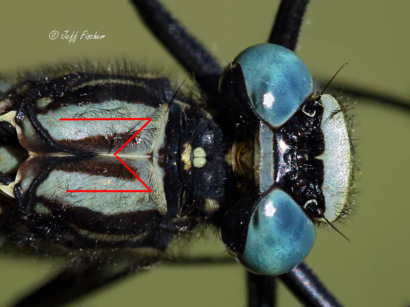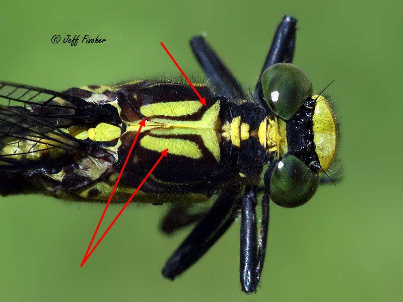 The pattern on the top of the thorax, behind the eyes, for most Clubtails, other than Snaketails, falls into one of three categories