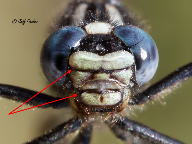 Some species of Clubtails have black markings at the base of the frons and other places on the face. While most species have unmarked faces.