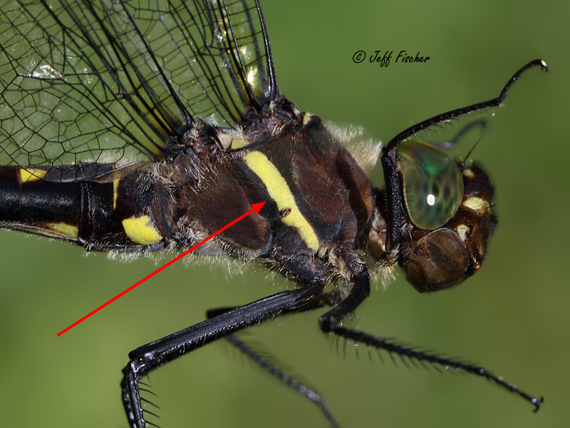 Dragonflies that have eyes that meet over a small to medium sized margin fall into three different families, Cruisers (Macromiidae), Emeralds (Corduliidae) and Skimmers (Libellulidae). Because these families are so similar it can be hard to distinguish which family a specimen belongs to. Members of the Cruiser Family (Macromiidae) are large with a single light stripe running down the center of their thorax
