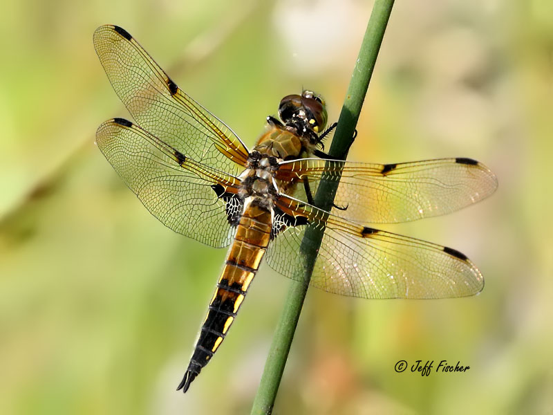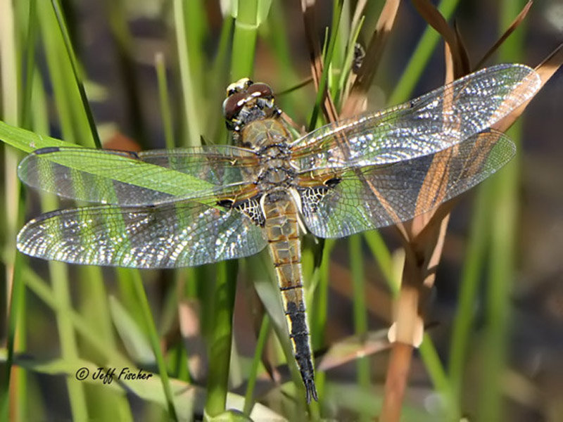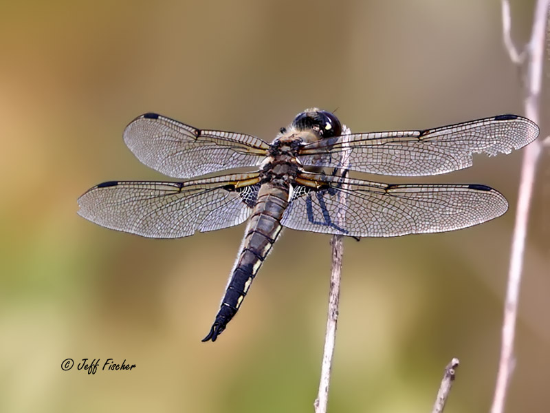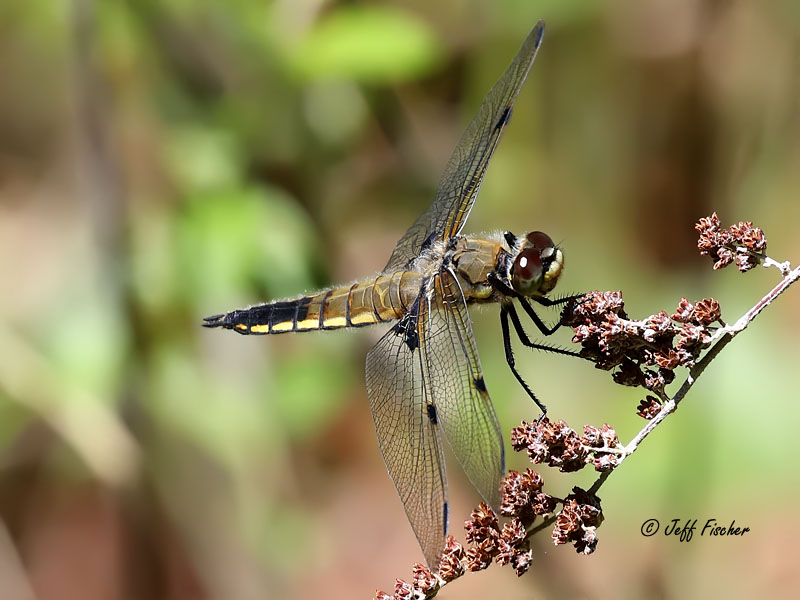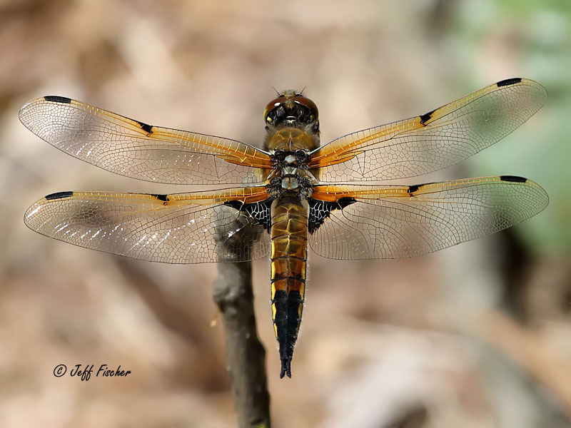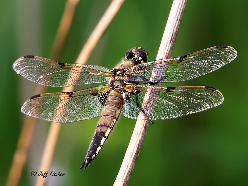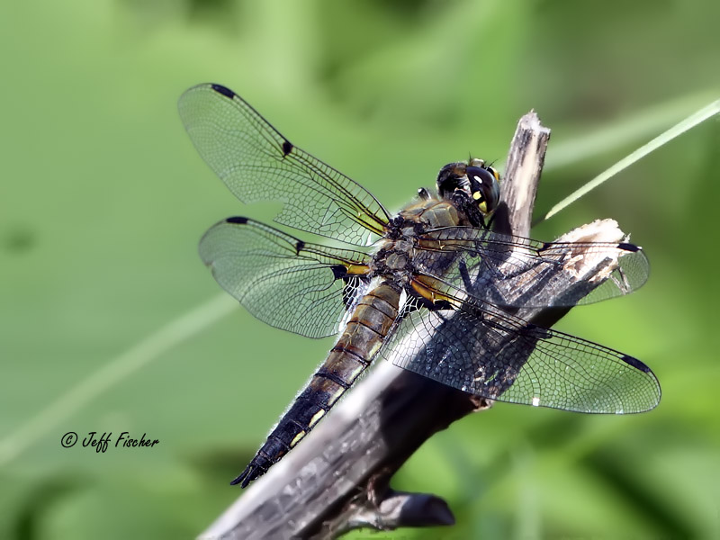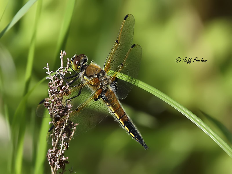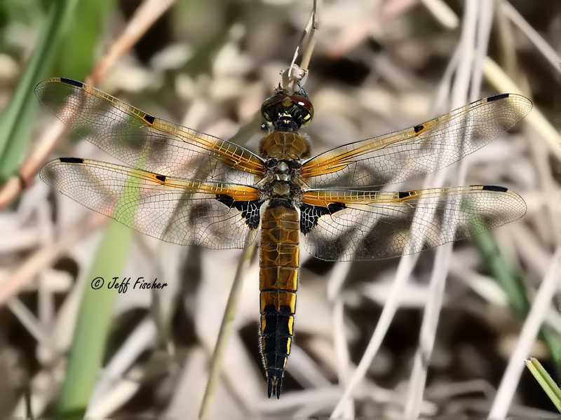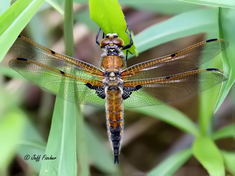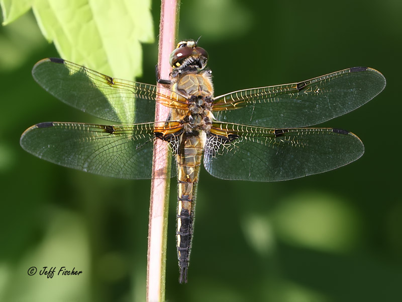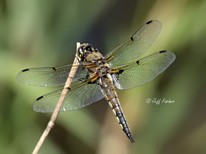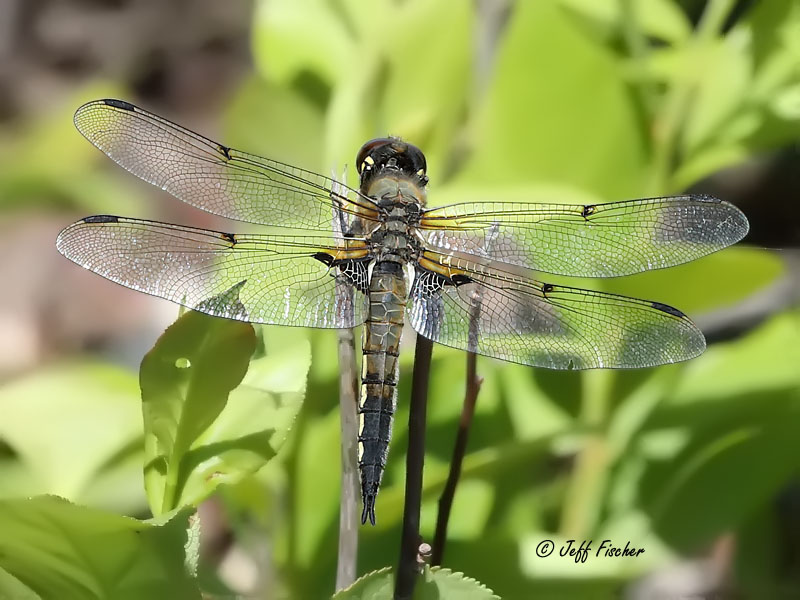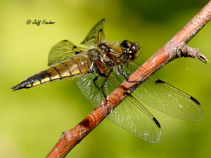 The four-spotted skimmer is an amber to brown colored dragonfly that is commonly found throughout most of Minnesota. They get their name from the two spots they have on each wing, a black spot at the nodus and a black stigma. With both wings this gives them four spots