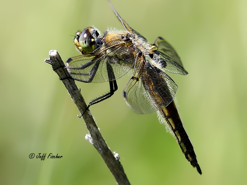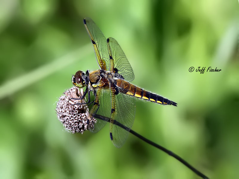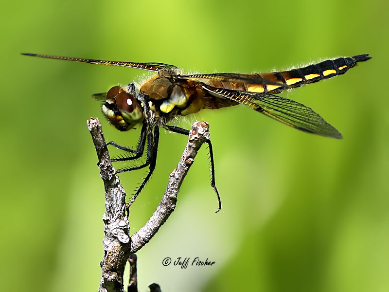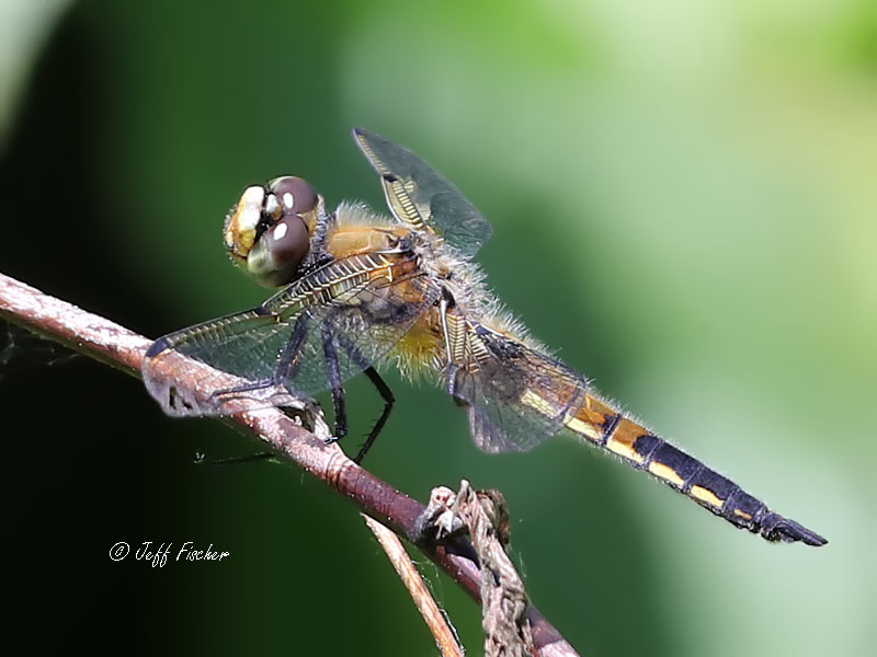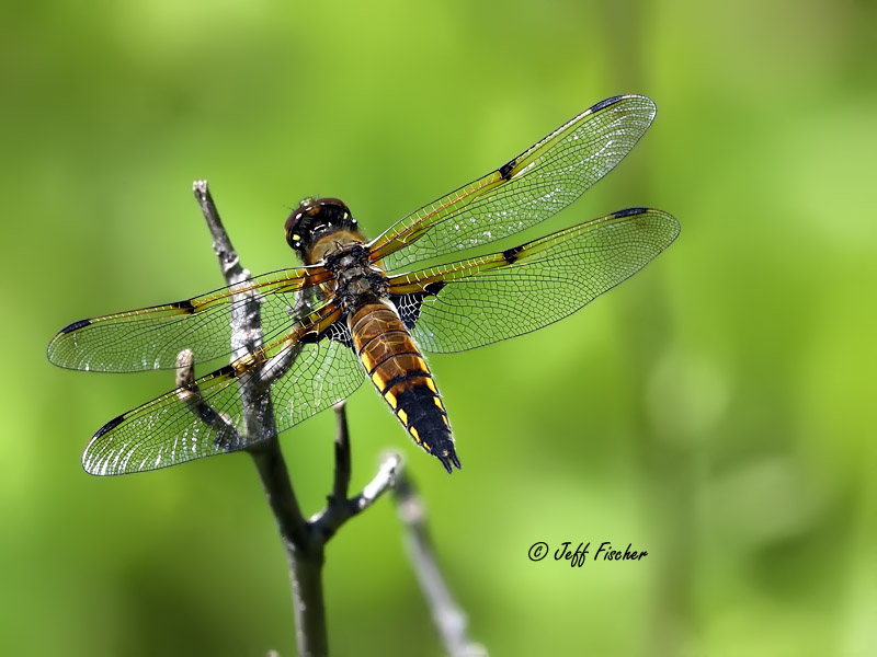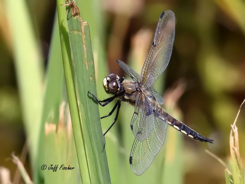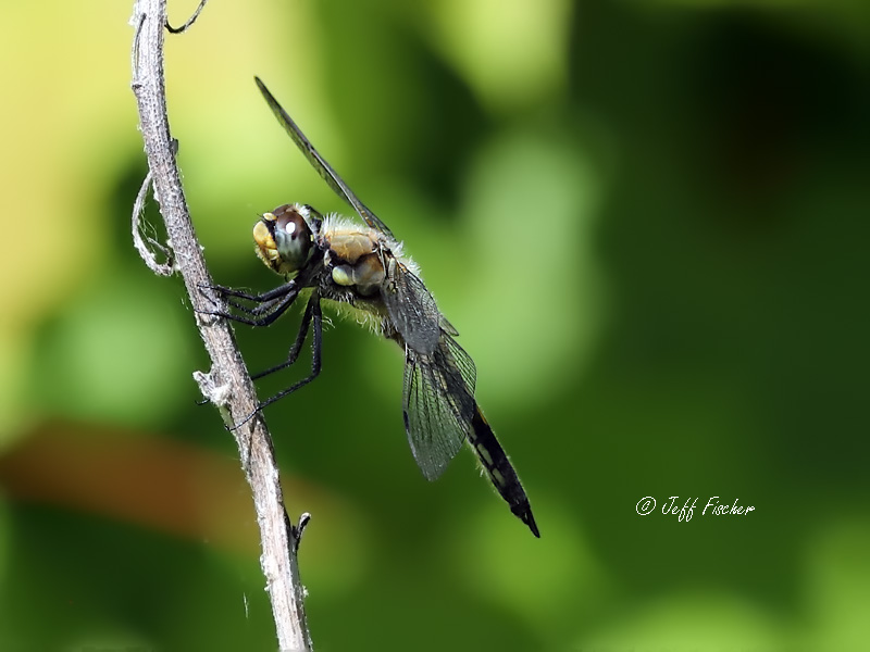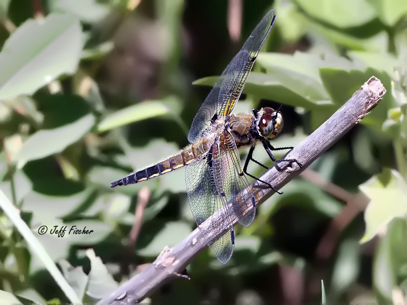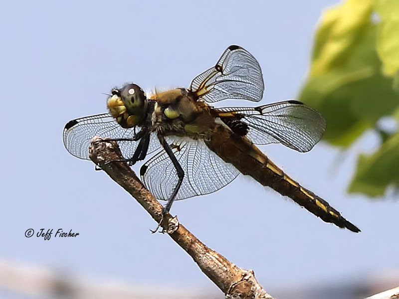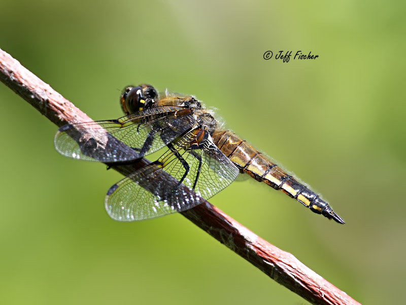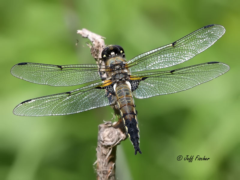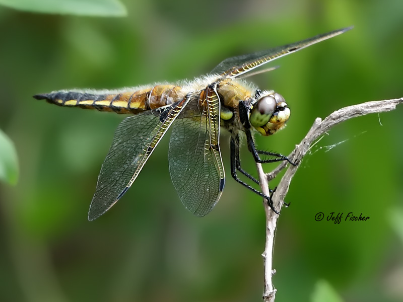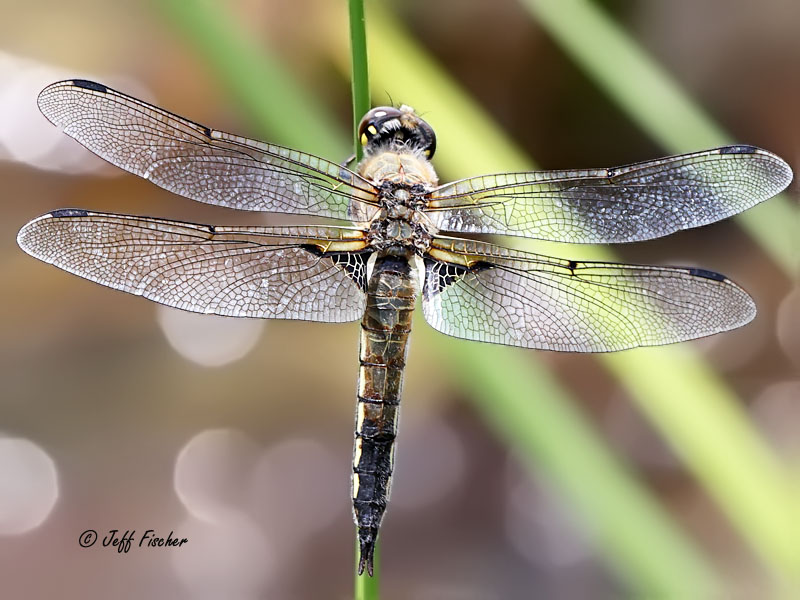 The four-spotted skimmer is an amber to brown colored dragonfly that is commonly found throughout most of Minnesota. They get their name from the two spots they have on each wing, a black spot at the nodus and a black stigma. With both wings this gives them four spots
