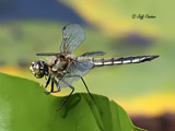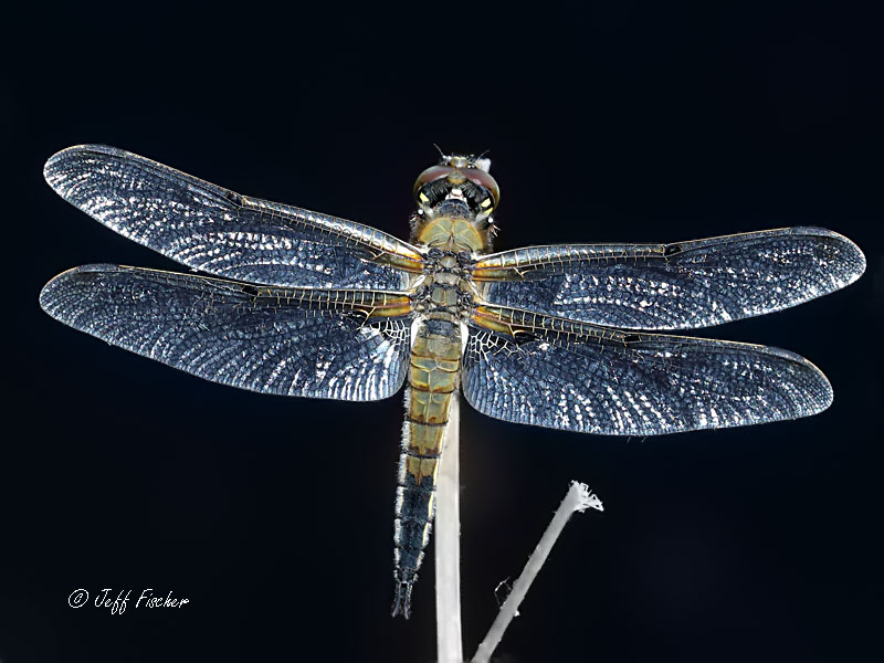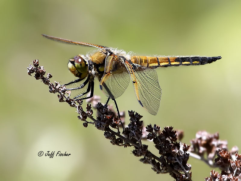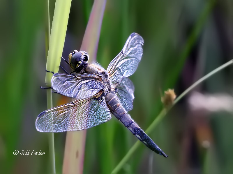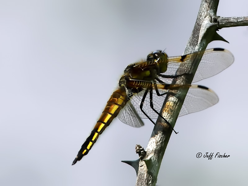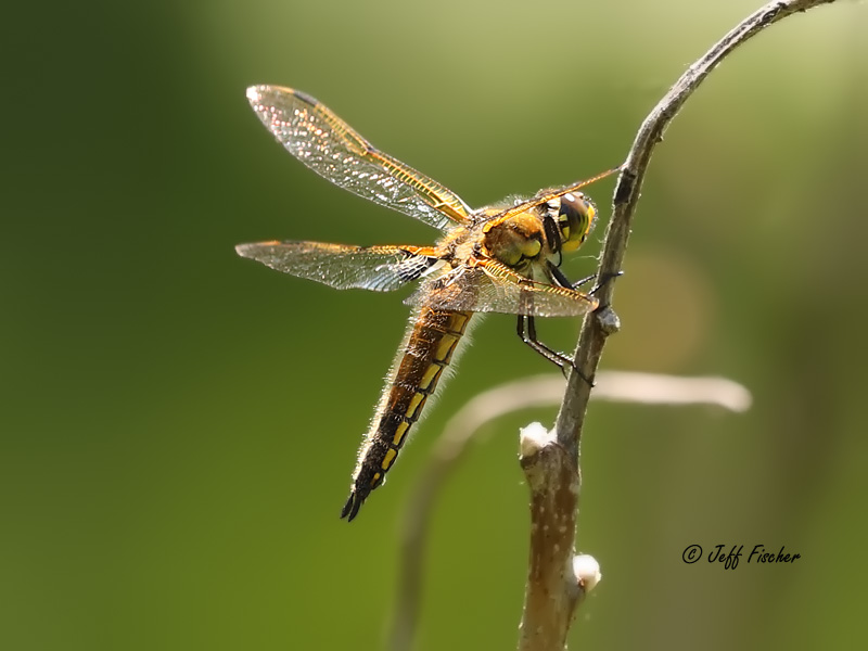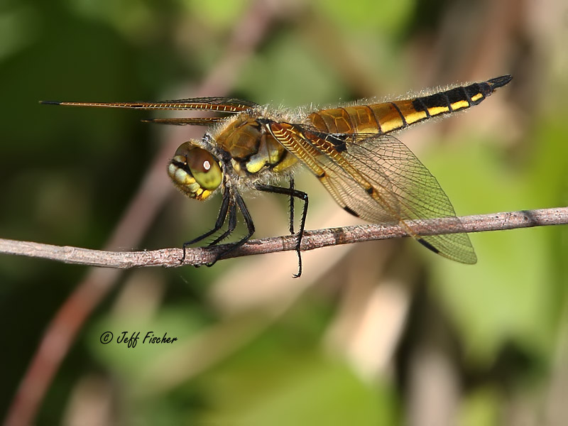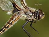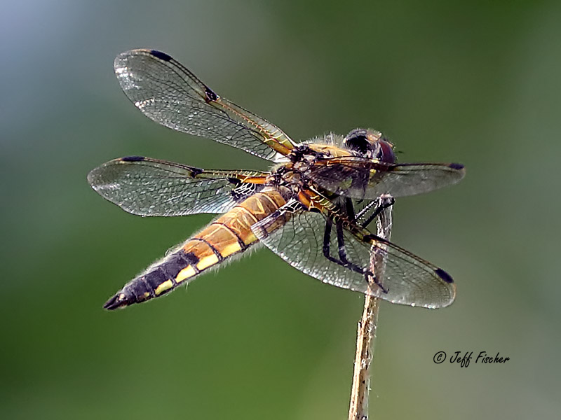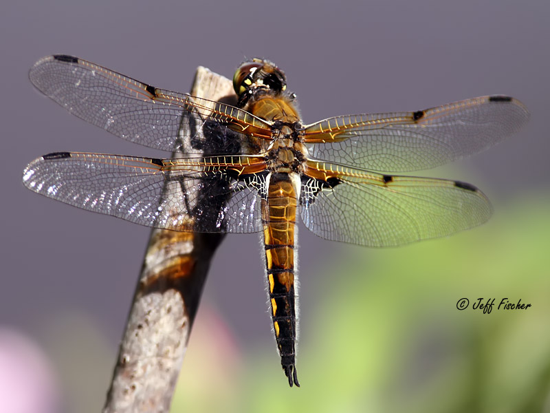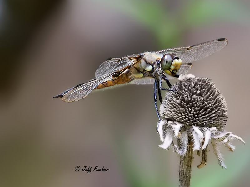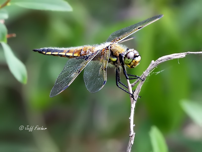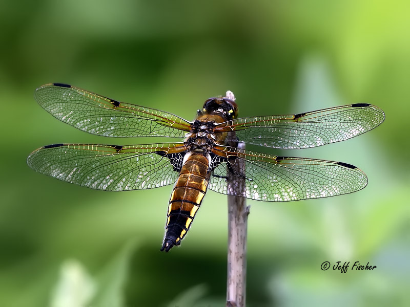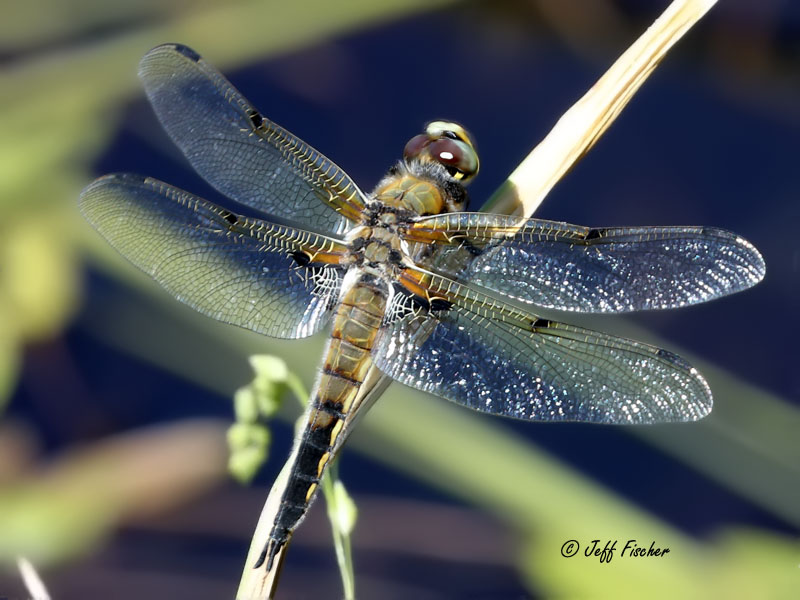 The four-spotted skimmer is an amber to brown colored dragonfly that is commonly found throughout most of Minnesota. They get their name from the two spots they have on each wing, a black spot at the nodus and a black stigma. With both wings this gives them four spots