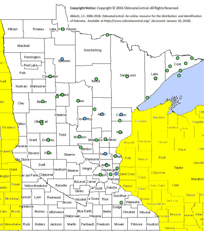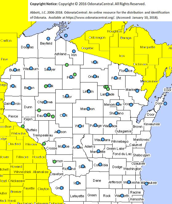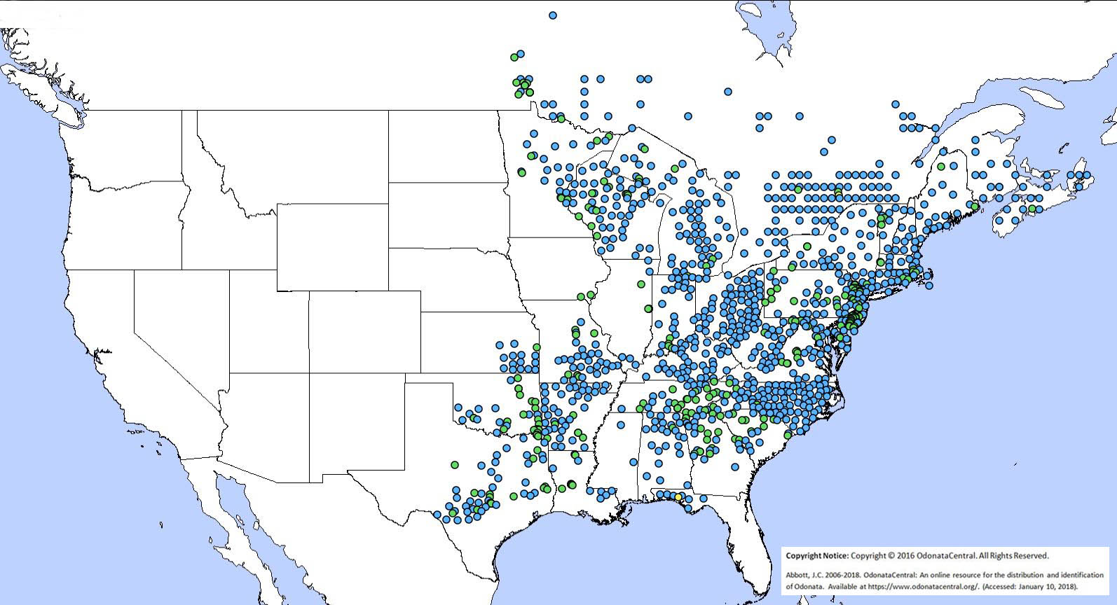 Range maps and checklists courtesy of Odonata Central. Copyright © 2016 OdonataCentral. All Rights Reserved. Abbott, J.C. 2006-2018. OdonataCentral: An online resource for the distribution and identification of Odonata. Available at www.odonatacentral.org.