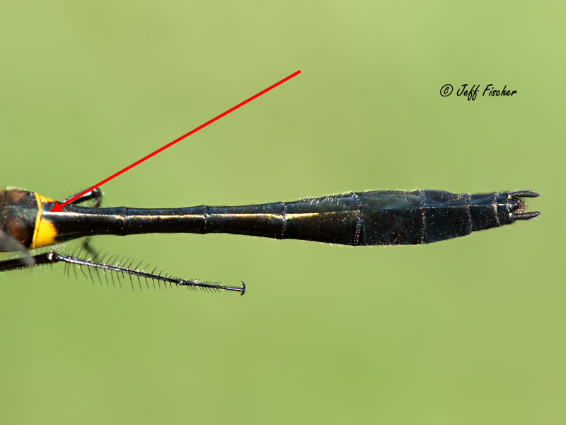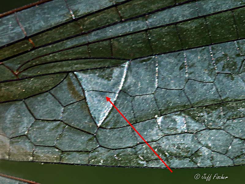 Does the specimen have a thin white ring between segments 2 and 3, a spiked epiproct and a cross vein in the forewing triangle?
