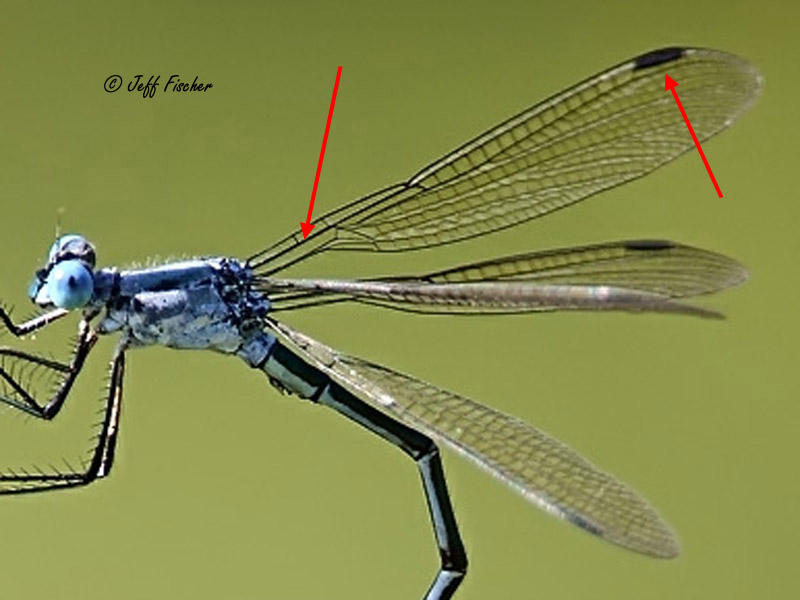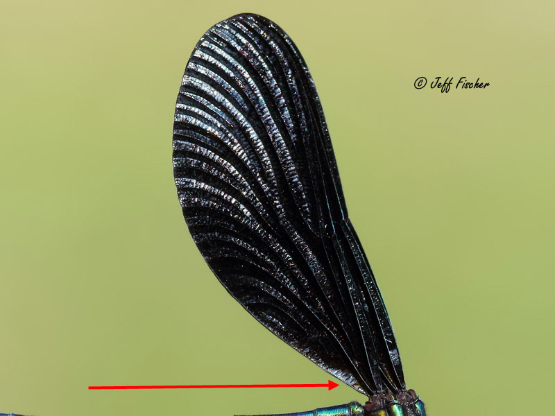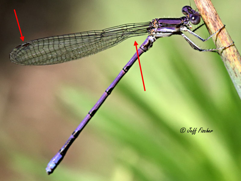 Once you have identified that the forewing and the hindwing are roughly the same size and shape then you have determined that your specimen is a Damselfly, or a member of the suborder Zygoptera. Damselflies are typically thinner than Dragonflies, always have their eyes separated, and usually perch with their wings folded together over their back. There are 3 families of Damselflies found in the region
