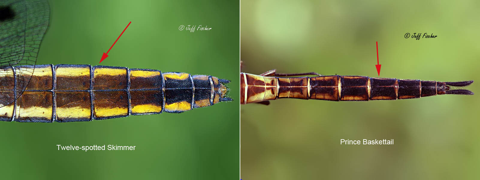 Male twelve-spotted skimmers are easily recognizable even from a distance, due to heir large size and striking wing pattern. Males have brown and bluish gray bodies with alternating black and white spots on their wings. Females are less colorful with brown and yellow bodies and black spots on their wings.