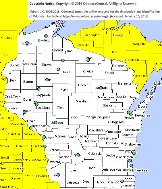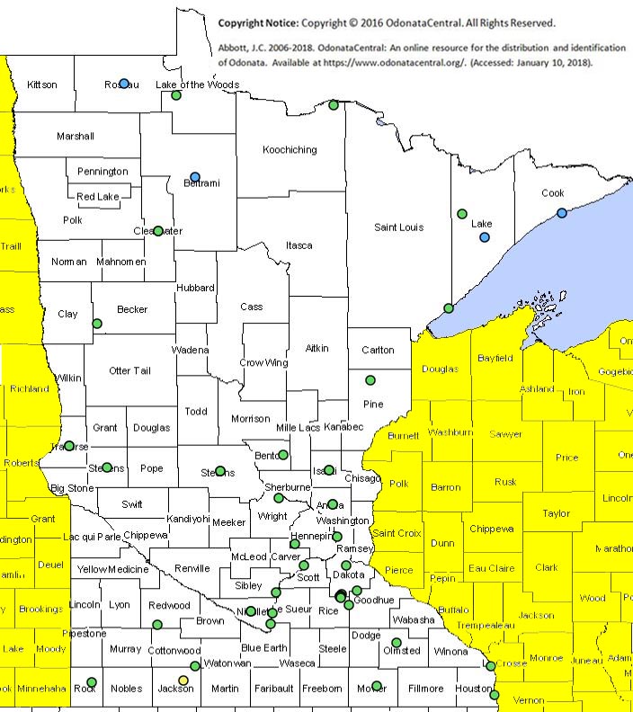 Range maps and checklists courtesy of Odonata Central. Copyright © 2016 OdonataCentral. All Rights Reserved. Abbott, J.C. 2006-2018. OdonataCentral: An online resource for the distribution and identification of Odonata. Available at www.odonatacentral.org.