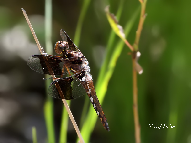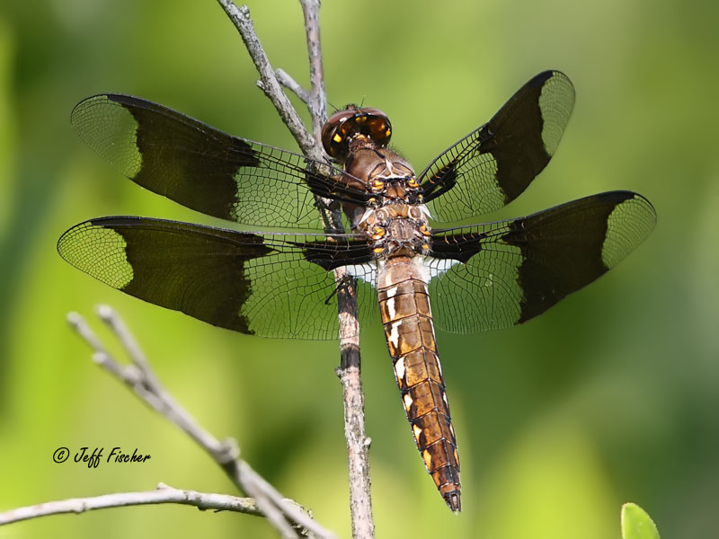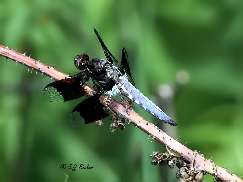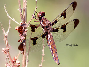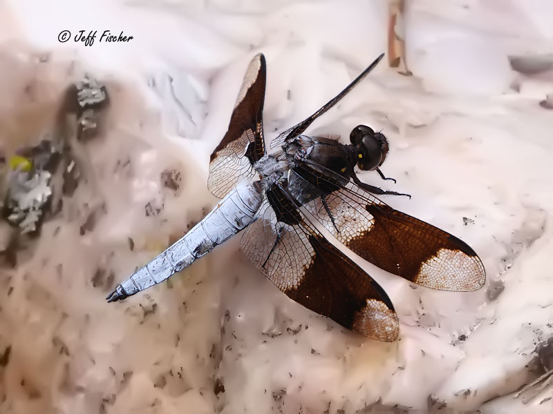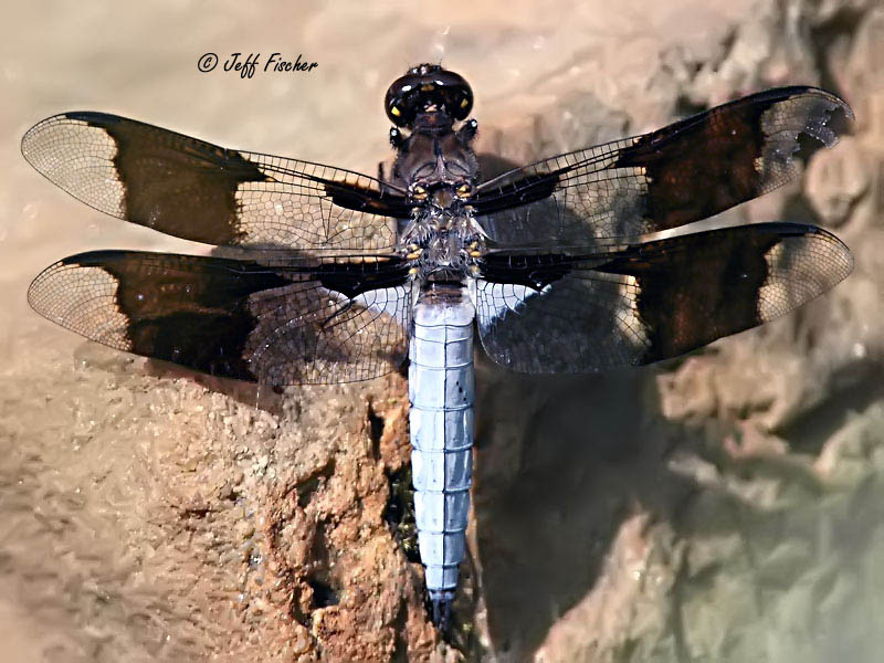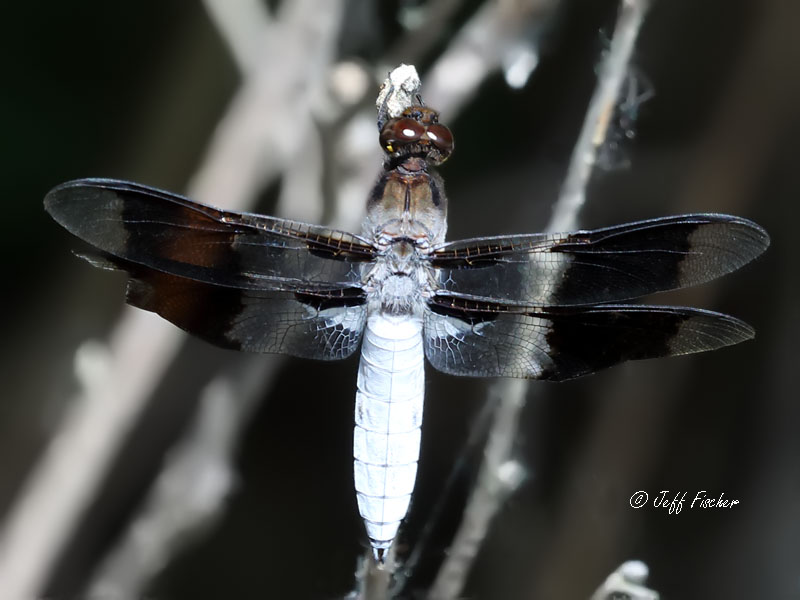 The Common Whitetail is a medium sized King Skimmer with black patches on the wings. The female looks like a smaller version of the female Twelve-spotted Skimmer, with black patches at base, mid, and tips of the wings. Males have a bright white abdomen with black patches in the middle of the wings