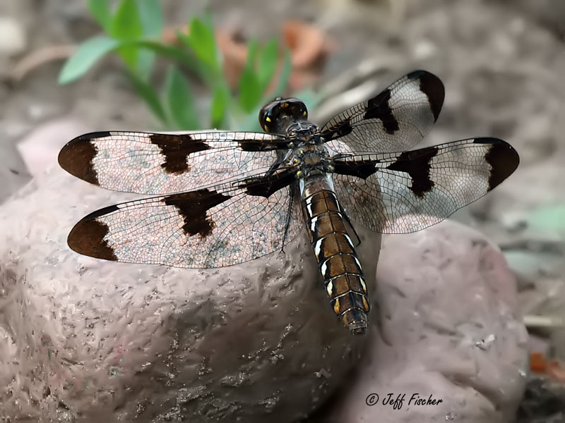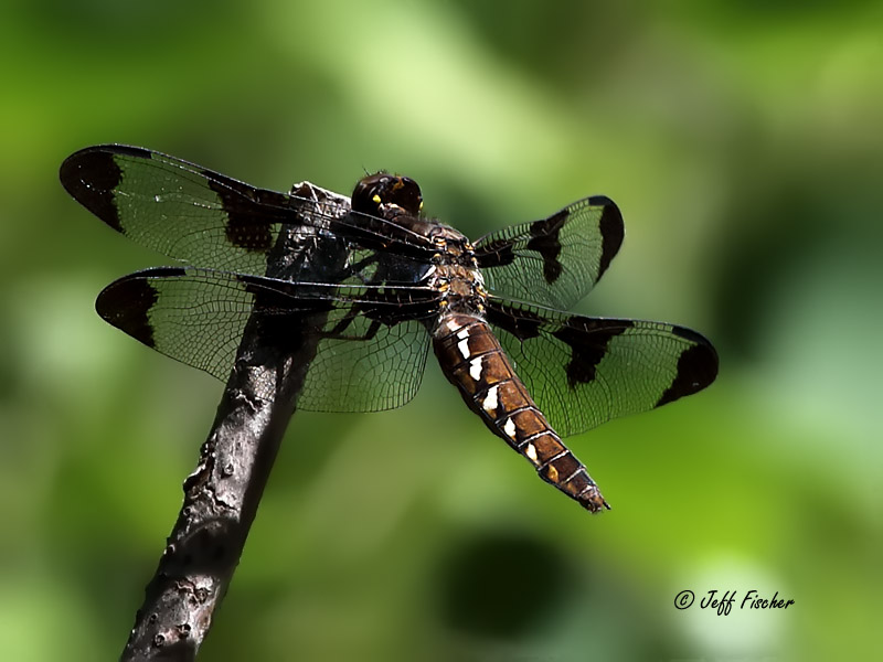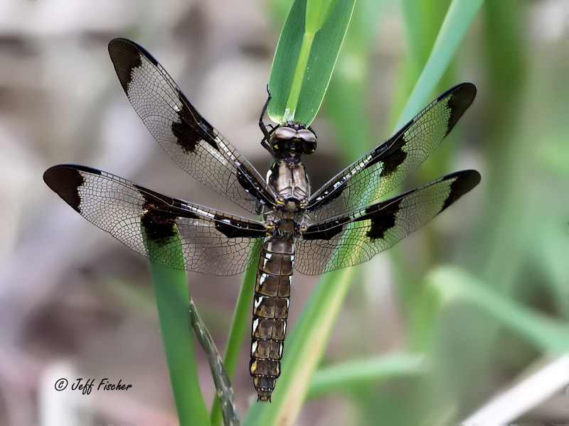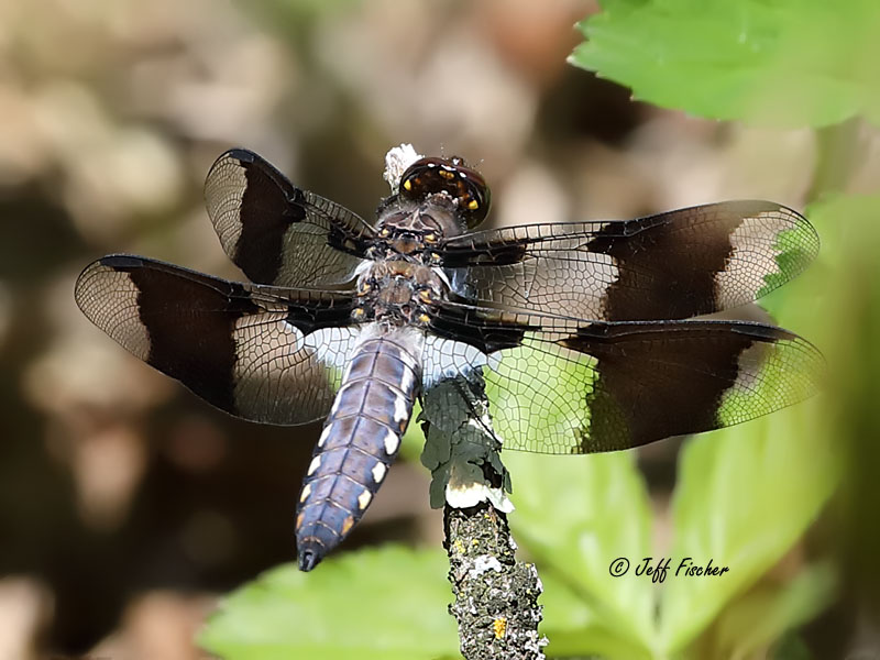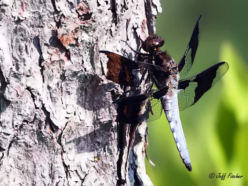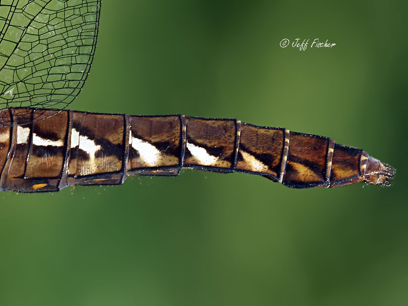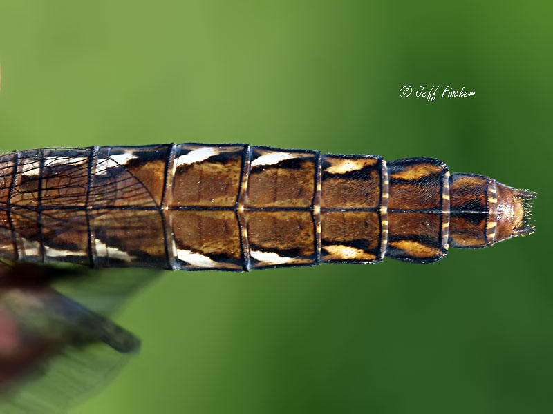 The Common Whitetail is a medium sized King Skimmer with black patches on the wings. The female looks like a smaller version of the female Twelve-spotted Skimmer, with black patches at base, mid, and tips of the wings. Males have a bright white abdomen with black patches in the middle of the wings