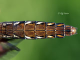 Reproduction is quick, lasting only seconds, and happens in flight. Females can lay up to 1000 eggs per day by slapping their abdomen on the surface of the water while the male hover guards. Other males often attempt to sneak in and mate with the female while she is laying since it is the last sperm packets deposited that are used to fertilize the eggs
